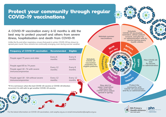 WA Primary Health Alliance (WAPHA) has created a COVID-19 Vaccination Reminder poster that includes reminders for health professionals and the wider community on how to continue to protect ourselves and others through regular vaccinations throughout the year.